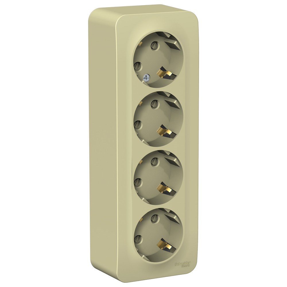 Розетка Systeme Electric (ранее Schneider Electric) BLANCA (открытой установки, цвет бежевый) четырёхместная с заземлением и шторками, с изолирующей пластиной подходит для сетей 250 В, на ток 16 А. - Заземляющий контакт обеспечивает дополнительную защиту от удара электрическим током. При наличии заземления электрический потенциал уходит в землю, защищая человека. - Входные отверстия расположены под углом 45 градусов, благодаря чему можно подключить несколько устройств: вилки и адаптеры не будут мешать друг другу. -Корпус изделия выполнен из ABS-пластика.