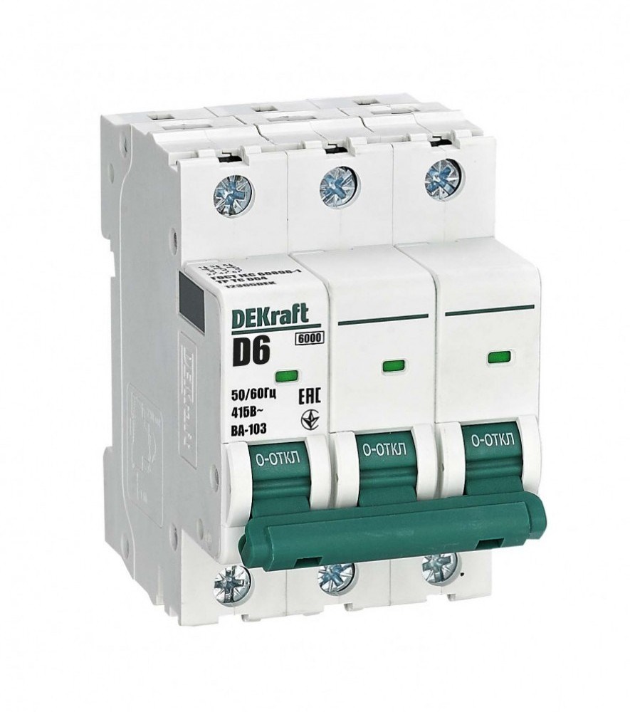 Автоматический выключатель серии ВА-103 NEW DEKraft; 3P; номинальный ток 6 А; характеристика D; отключающая способность 6 кА, что позволяет использовать аппараты в качестве вводных. 5 монолитных заклепок повышают прочность корпуса аппарата. Окошко-индикатор всегда показывает состояние контактов вне зависимости от положения рукоятки управления. Боковые каналы охлаждения повышают стабильность работы при высоких температурах окружающей среды. Есть возможность установки дополнительных аксессуаров с левой стороны устройства. Аппарат на 100% совместим с корпусами и оболочками DEKraft, Systeme Electric.
