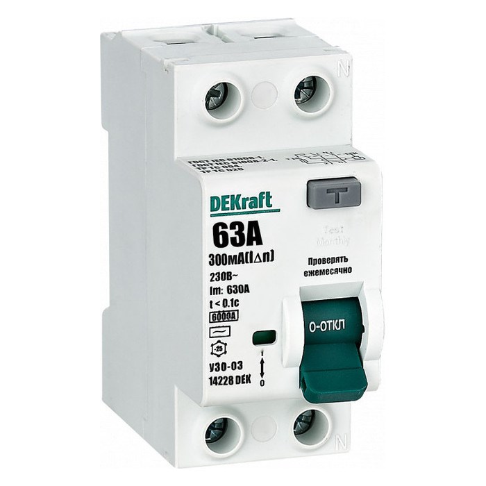 Выключатель дифференциального тока серии УЗО-03 DEKraft; 2P; номинальный ток 63 А; ном.дифф. ток 300 мА; электромеханический; тип дифференциального расцепителя - AC; на DIN-рейку. ВДТ устанавливаются в сетях напряжением до 400 В пер.тока. ВДТ применяются для защиты электроустановок от риска возникновения пожаров вследствие утечек тока. Конструкция устройств позволяет эксплуатировать их даже при низкой температуре. При сборке выключатель дифференциального тока (ВДТ) и автоматический выключатель (для защиты ВДТ) устанавливаются последовательно, при этом номинальный ток аппарата должен быть на одну ступень выше - т. е. 20А при установке последовательно с автоматом на 16А, 32А при установке с автоматом на 25А.