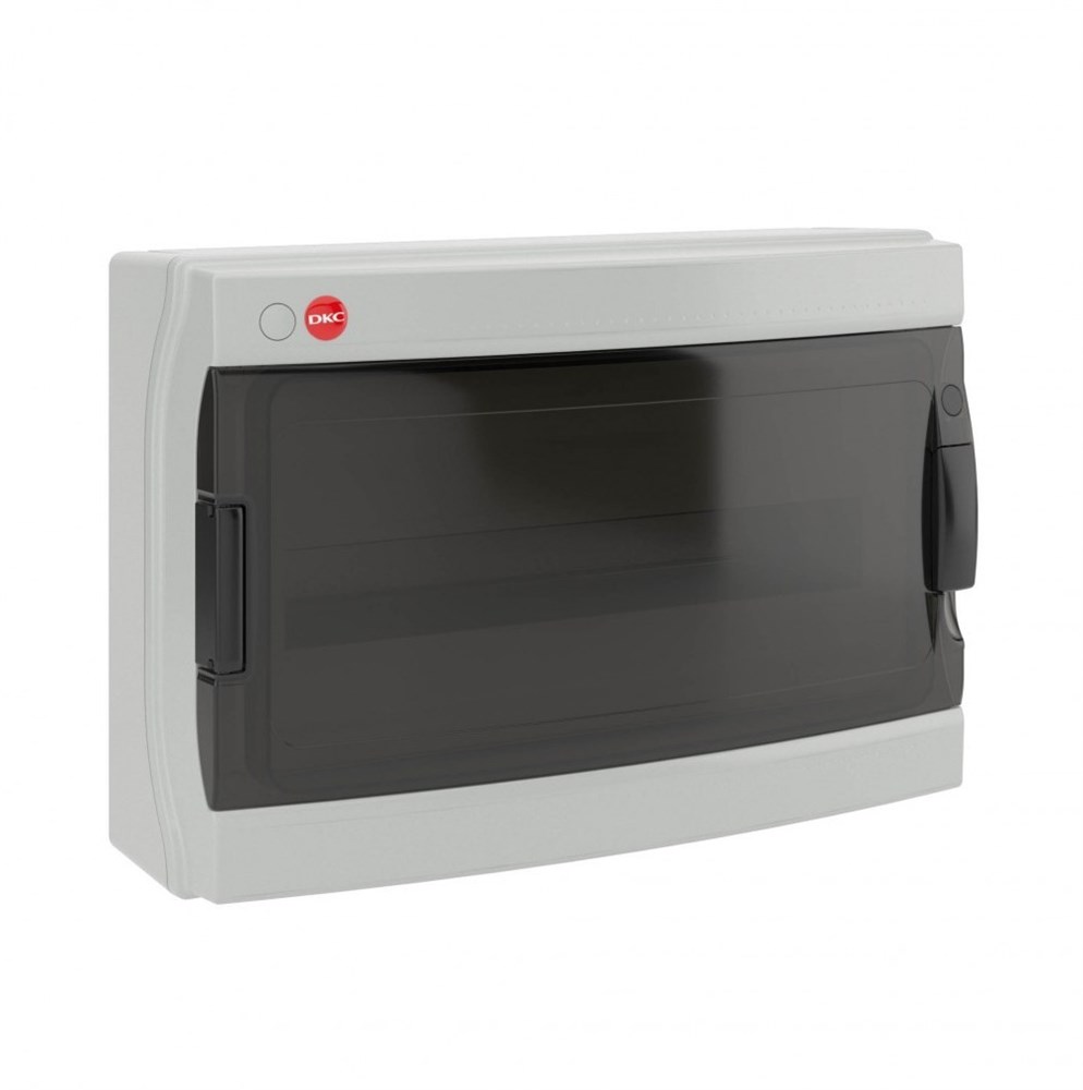 Настенный модульный щиток с прозрачной затемненной дверцей. Предназначен для монтажа в жилых и административных помещениях для установки автоматических выключателей любых производителей: таймеров, устройств защитного отключения и управления освещением и т.д. В комплект поставки входят: клеммные блоки 2 x (2x16mm2 + 12x10mm2), ручка на дверце, оцинкованная DIN-рейка, заглушки для пустых модулей, заглушки на пазы для крепления к стене, сборочные винты. Степень пыле- и влагозащиты IP 65. Ударопрочность корпуса IK09. Количество модулей - 18. Параметры щитка: ширина - 408 мм, высота - 280 мм, глубина - 133 мм. Материал - термостойкий пластик. Цвет - серый..
