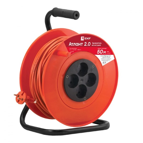 EKF PROxima Удлинитель на катушке "Атлант 2.0" 4 гнезда 50м без заземления ПВС 2*0,75 6А/1,3кВт UKA02-06-275-4-50