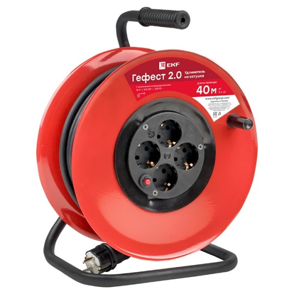 EKF PROxima Удлинитель на катушке "Гефест 2.0" 4 гнезда 40м с заземлением и предохранителем КГ 3*1,5 16А/3,5кВт UKG02-16-R315-4-40