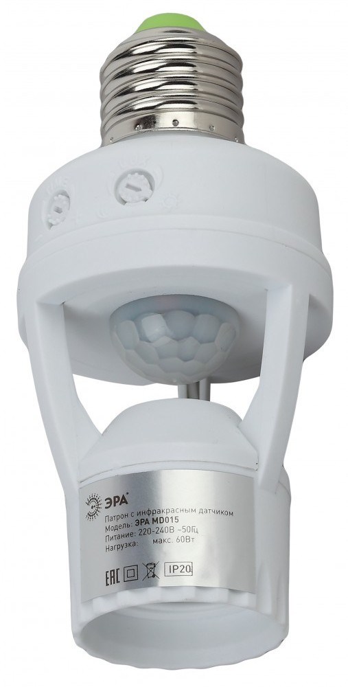 Простое устройство для экономии электроэнергии. В датчик-патрон вкручивается лампа с цоколем Е27, затем датчик с лампой вкручивается в стандартный патрон. Максимальное удобство в использовании и никаких дополнительных электромонтажных работ. Инфракрасный датчик-патрон MD15 от ЭРА имеет угол обзора 360 градусов и улавливает движение на расстоянии 6 метров. Вкрученная в него лампа автоматически включается, когда вы входите в помещение, и выключается, когда вы покидаете комнату. Больше не нужно подолгу нащупывать в темноте выключатель или ругать домочадцев за то, что забыли выключить свет. Датчик-патрон ЭРА сделает всё за вас. Инфракрасный датчик - самый распространённый и безопасный тип датчиков. Он улавливает инфракрасные волны, свойственные всем теплокровным существам: человеку или животным. Свет в помещении будет только в те минуты, когда вам это нужно. Так можно сэкономить до 80% электроэнергии.