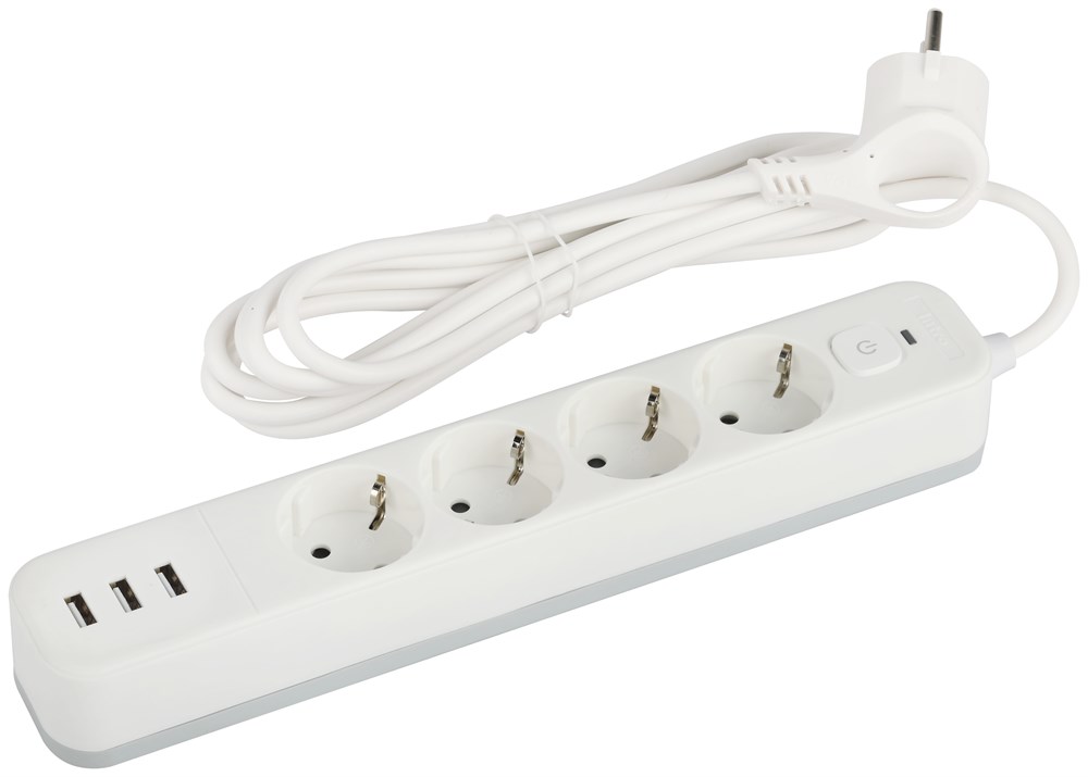Сетевой фильтр ЭРА USF-4es-1,5m-3xUSBA-W с заземлением, с выключателем, 4 розетки, 3USB, провод 1,5 м, ПВС 3x0,75мм2. Базовый уровень защиты техники: от импульсных помех, от перегрузки, от короткого замыкания. Максимальная мощность 10А/2200 Вт. Корпус из негорючего пластика (полипропилен). Вилка обеспечена кольцом для удобного извлечения ее из розетки. Выключатель со световой индикацией позволяет выключить все приборы, подключенные к сетевому фильтру, не вынимая вилки из розетки. Отлично подойдет для защиты бытовой и компьютерной техники. Сетевой фильтр оснащен 3USB для зарядки мобильных устройств.