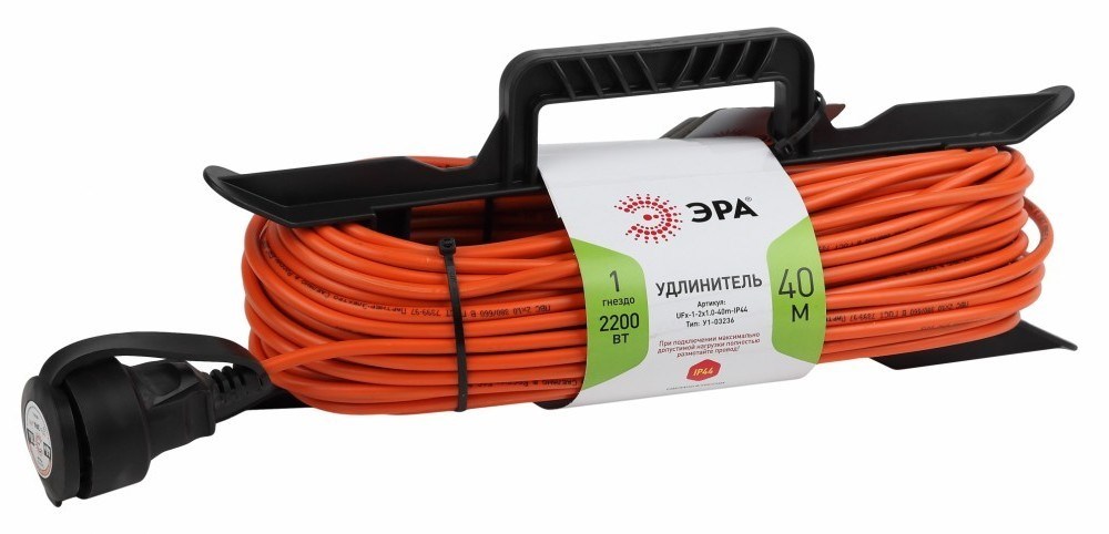 Удлинитель силовой на рамке UFx-1-2x1.0-40m без заземления, ПВС 2х1м2, 1 розетка, 40м, степень защиты IP20. Мощность 10А/2200Вт. Используется для работы на строительных площадках или дачных участках. Удобен при работе с приборами находящимися удаленно от стационарной розетки. Например, газонокосилки, электрические, пилы, триммеры или электродрели. Провод в удлинителях Эра сделан из 100% меди, что делает его абсолютно пожаробезопасным. Рама-полипропилен.