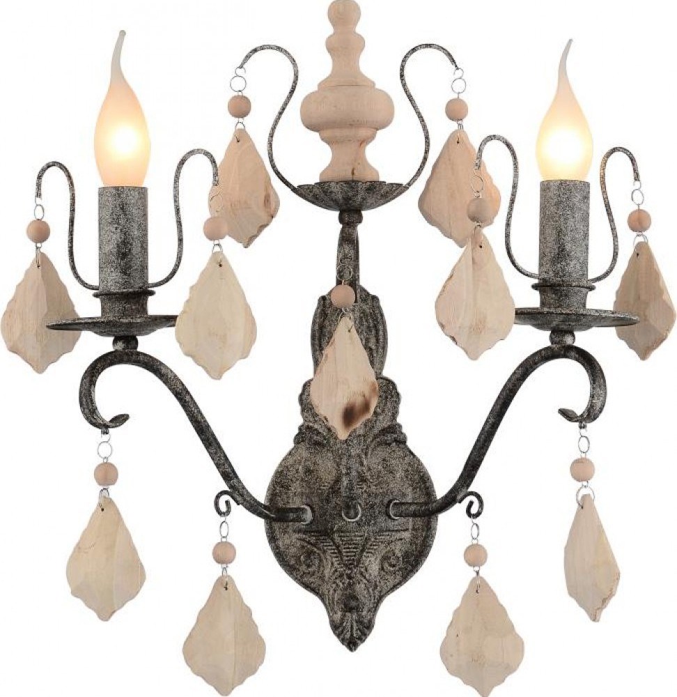 настенный светильник; Крепление-планка; Размер светильника-D165*W400*H425; Лампы-2*E14*40W, excluded; Цвет, отделка-каркас грязно-серого цвета грубого окраса, декоративные подвески из дерева