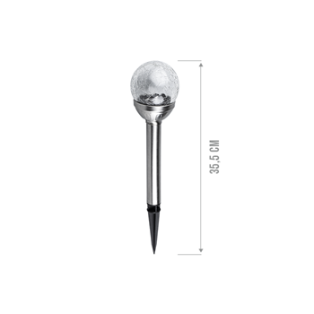 Светодиодный светильник с солнечной батареей, устанавливается в грунт. Предназначен для декоративной подсветки садовых и дачных участков, цветников, дорожек. Автоматическое включение/выключение при наступлении темного/светлого времени суток (датчик освещенности) Цвет свечения: мультицветный (автоматическое изменение цвета) Время непрерывной работы при полностью заряженном аккумуляторе 8 часов. Материал корпуса: нержавеющая сталь, пластик. Плафон отлит по технологии растрескавшегося стекла.