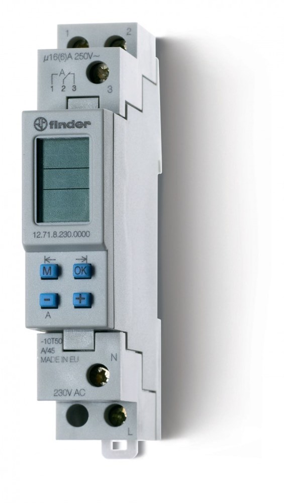 Finder Реле времени цифровое недельное; программируется ПК (012.00); монтаж на рейку 35мм; 1СO 16A; питание 24В АC/DC; ширина 17.8мм; степень защиты I 127100240000PAS