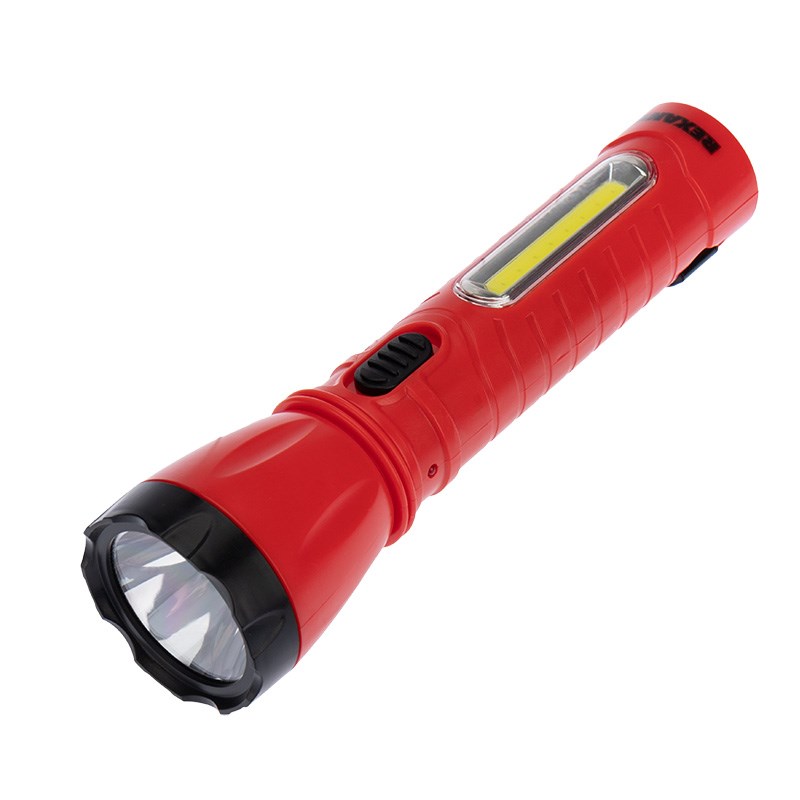Мощный фонарь REXANT с возможностью зарядки от розетки используется как поисковый и как кемпинговый фонарь с мощным боковым светом.