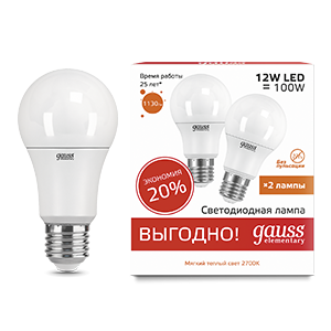 Gauss Лампа Elementary A60 12W 3000K E27 (2 лампы в упаковке) LED 1/50 23212P