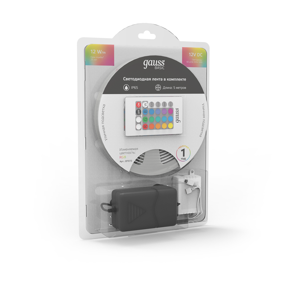Gauss Лента Basic в комплекте 12V 12W/m 780lm/m RGB IP65 LED 5m 1/50 BT072