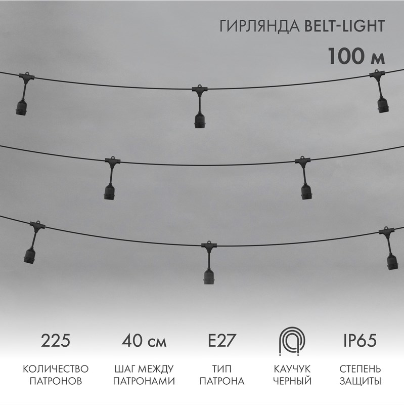 Гирлянда Belt-Light 2 жилы, 100м, шаг 40см, 225 подвесныx патронов Е27, IP65, черный круглый провод NEON-NIGHT 331-231