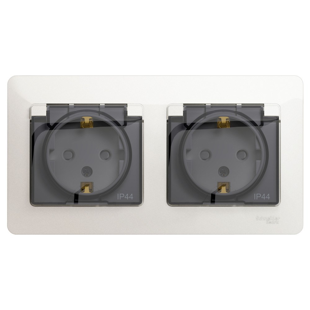 Розетка Systeme Electric (ранее Schneider Electric) серии Glossa (в сборе, цвет перламутр) двойная с заземлением, шторками и крышкой подходит для сетей 250 В, на ток 16 А. - Изделие со степенью защиты IP44 обеспечит безопасность использования в ванной и на кухне. - Заземляющий контакт обеспечивает дополнительную защиту от удара электрическим током. При наличии заземления электрический потенциал уходит в землю, защищая человека. - Выполнен из материала PС+ASA, стойкого к УФ-излучению и появлению царапин.
