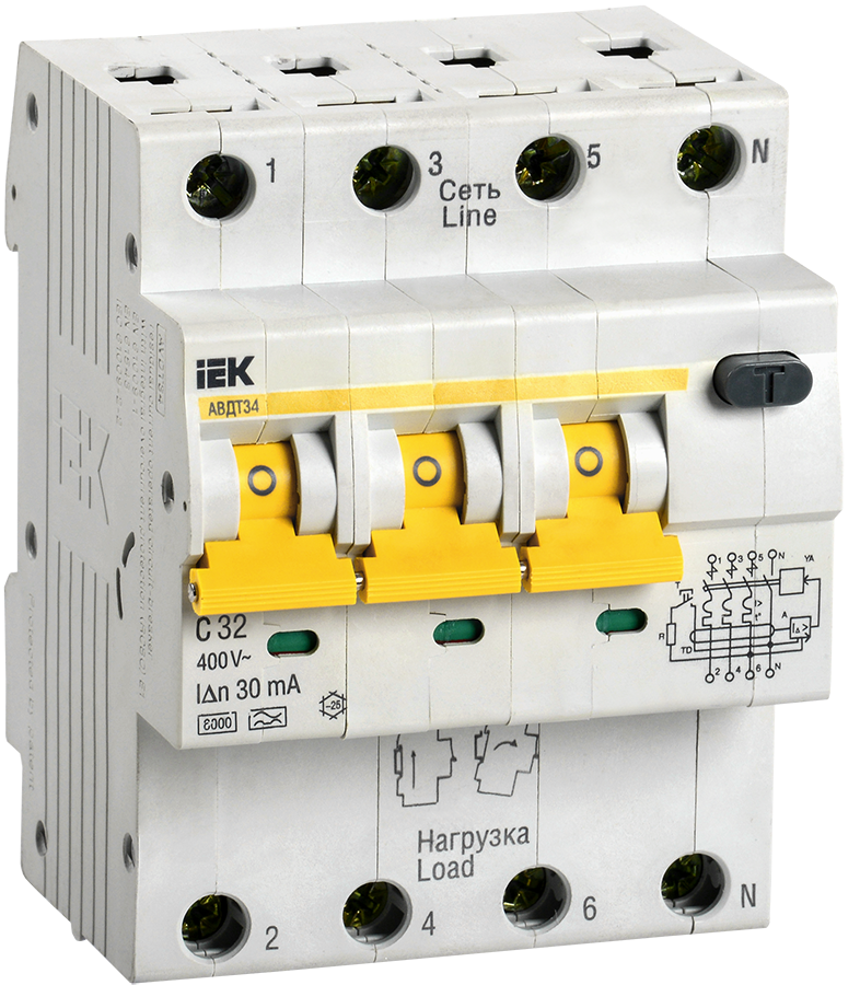 Автоматические выключатели дифференциального тока АВДТ34 предназначены для защиты человека от поражения электрическим током при повреждении изоляции электроустановок, для предотвращения пожаров вследствие протекания токов утечки на землю и для защиты от перегрузки и короткого замыкания в сетях переменного тока напряжением 400 В и частотой 50 Гц. АВДТ34 со встроенной защитой от сверхтоков реагируют не только на синусоидальные переменные дифференциальные токи, но и на пульсирующие постоянные дифференциальные токи. Источником пульсирующего тока являются, например, стиральные машины с регуляторами скорости, регулируемые источники света, телевизоры, видеомагнитофоны, персональные компьютеры и др. АВДТ34 выпускаются в четырехполюсном исполнении на номинальные токи 6, 10, 16, 20, 25, 32, 40, 50, 63 А и номинальные отключающие дифференциальные токи 10, 30, 100, 300 мА.