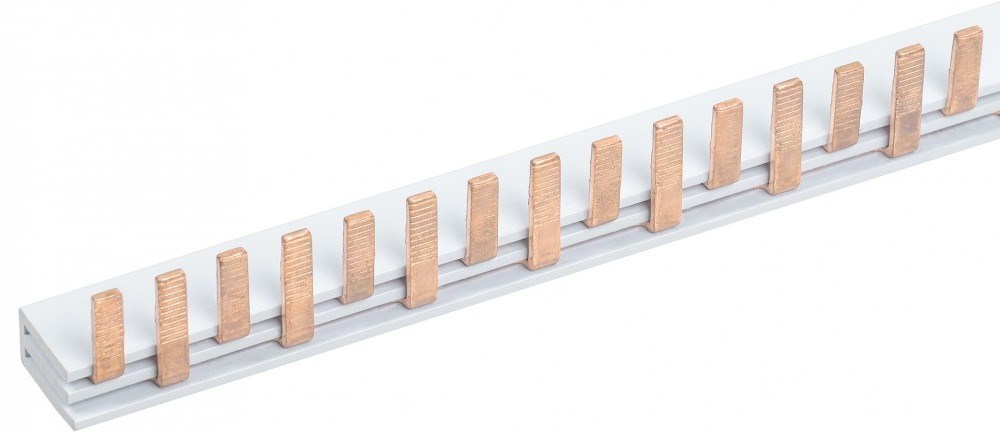 Обеспечивают удобное и быстрое соединение групп дифференциальных автоматических выключателей серии АВДТ32М со смещенным расположением вводных клемм. Шины, рассчитанные на номинальный ток 63 А, могут быть использованы с номинальным током 100 А, если вводной автомат подключать по центру. Шина для АВДТ32М на 108 модулей имеет выводы PIN через каждые 9мм (схема расположения модулей 1/2+1/2).