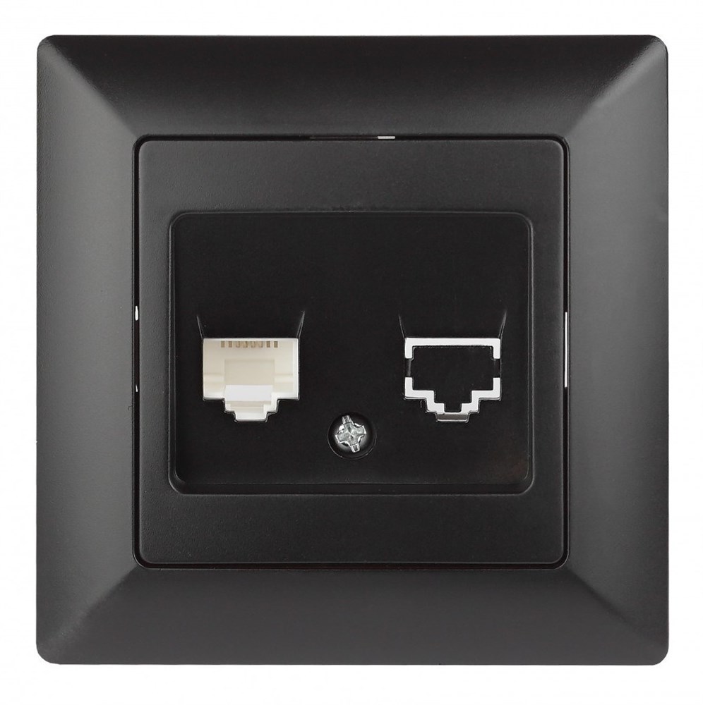 Розетка телефонная RJ11, серии Solo, скрытой установки 4-302-05 цвет антрацит. Выполнена из негорючего термопластика, укомплектована одноместной рамкой.
