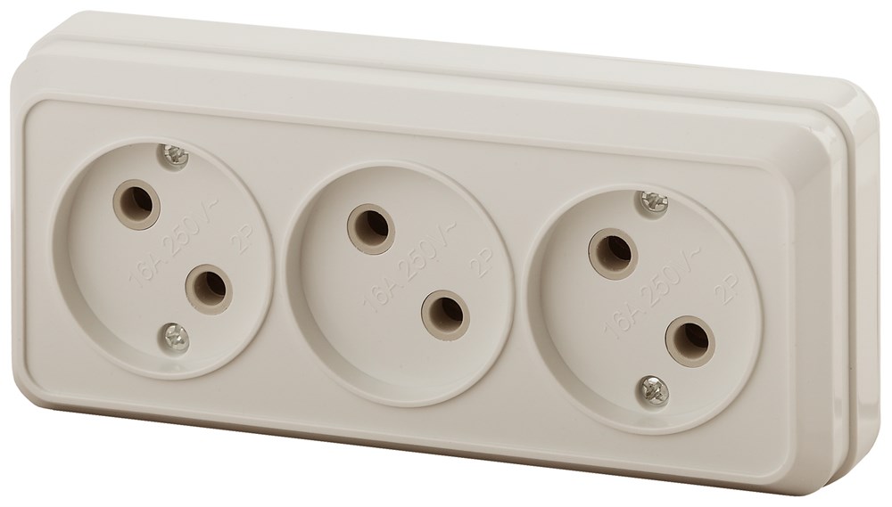 Розетка тройная 3-я серии Intro Quadro открытой установки цвет слоновая кость 2-205-02. Номинальные характеристики 16А 250В. Розетка выполнена из термопласта, стали и латуни, оснащёна винтовыми зажимами.