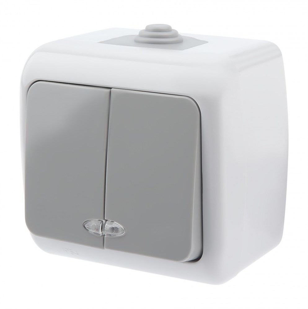 Выключатель двойной с подсветкой, 10А-250В, IP54, ОУ, Atlantic, серый