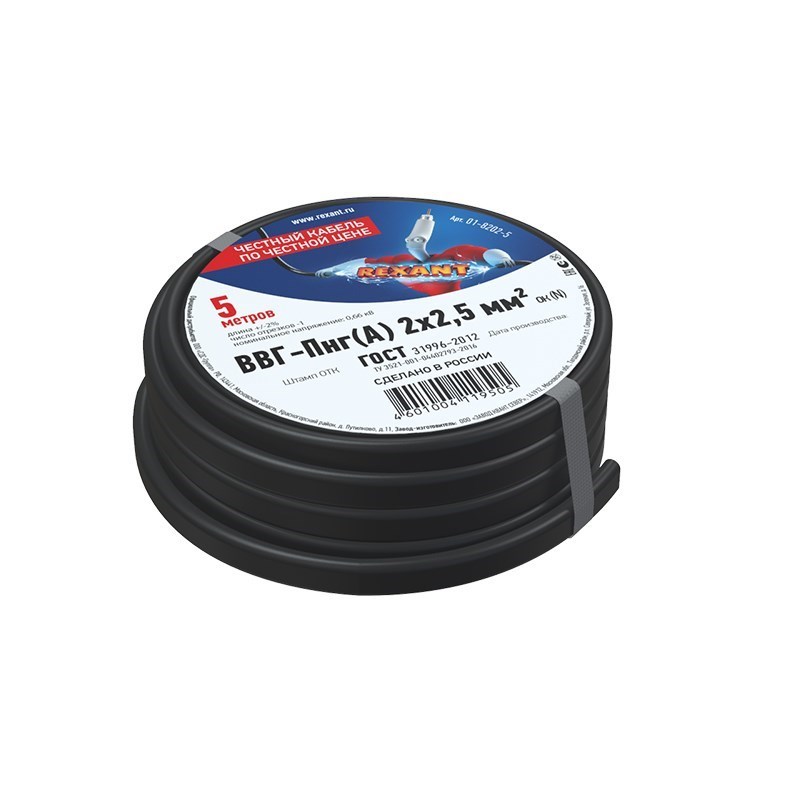 Кабель силовой медный ВВГ-Пнг(А) 2x2,5 мм², длина 5 метров, ГОСТ 31996-2012, ТУ 16-705.499-2010 Rexant 01-8202-5