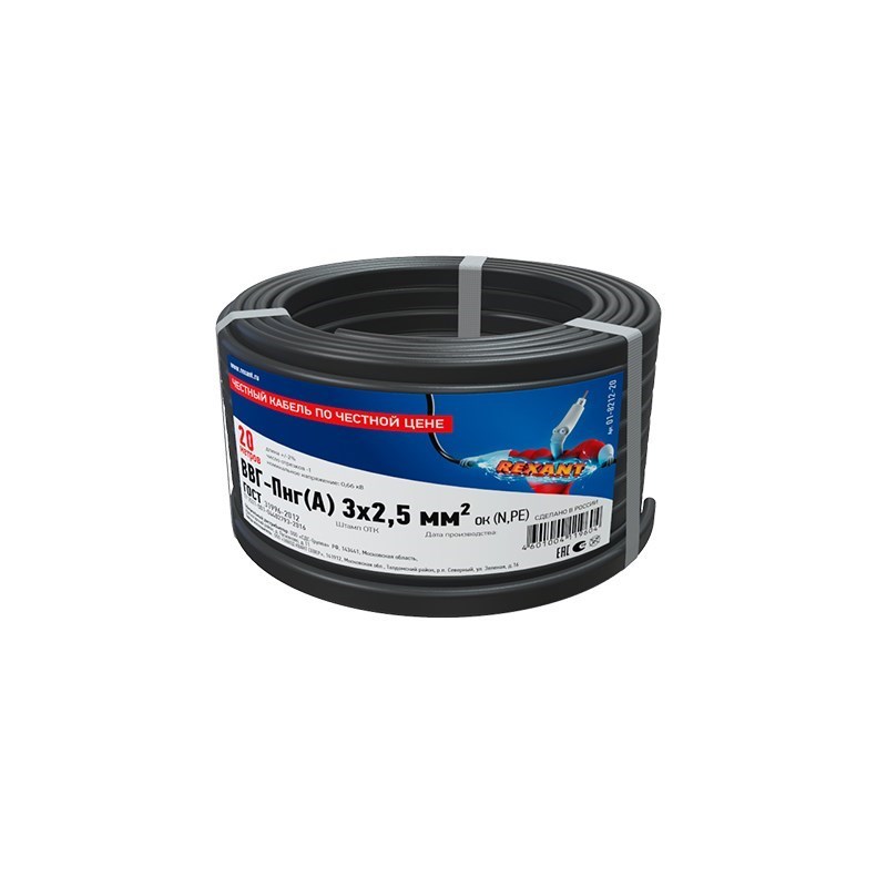 Кабель силовой медный ВВГ-Пнг(А) 3x2,5 мм², длина 20 метров, ГОСТ 31996-2012, ТУ 16-705.499-2010 Rexant 01-8212-20