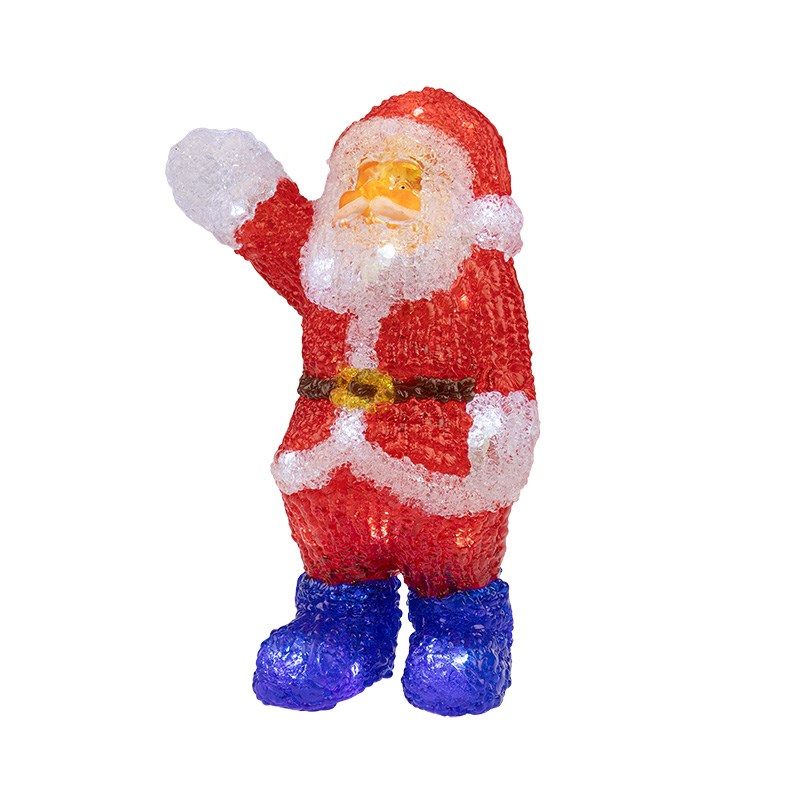 Акриловая светодиодная фигура "Санта Клаус приветствует" высотой 30 см станет прекрасным украшением интерьера, уличной площадки и поможет разнообразить привычное окружение. Светящаяся фигура выполнена из прочного акрила с фактурной поверxностью. 40 яркиx диодов излучают белый свет нейтрального оттенка, красиво обрамляя контур и создавая эффект объема. Понижающий трансформатор, идущий в комплекте, адаптирует изделие к стандартной электрической сети с напряжением 230 Вольт. Защита IP65 предполагает использование светодиодной фигуры как в помещенияx, так и на улице.