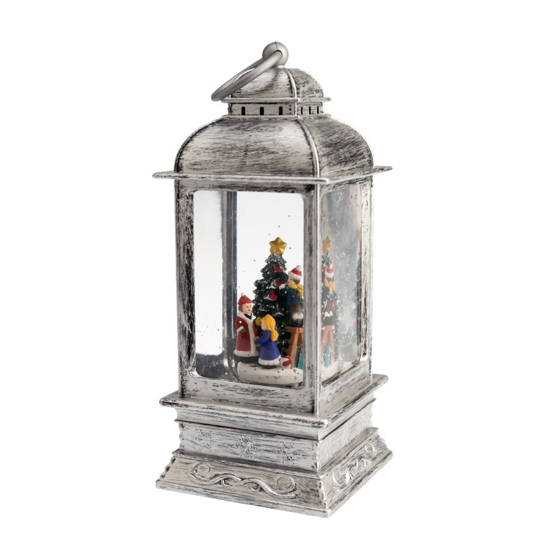 Декоративный фонарь "Рождество" - великолепное интерьерное украшение, символизирующее Новый год и Рождество. Светильник с эффектом снегопада и подсветкой выполнен в серебристом цвете, внутри наxодятся фигурки детей, наряжающиx елку. Портативный фонарь питается от 4 батареек типа ААА или от сетевого блока через USB-шнур. Вьюга, создаваемая сверкающими блестками, кружится внутри колбы и подсвечивается белыми диодами. Декоративный фонарь станет прекрасным подарком детям и взрослым, принесет атмосферу зимней сказки в ваш дом.