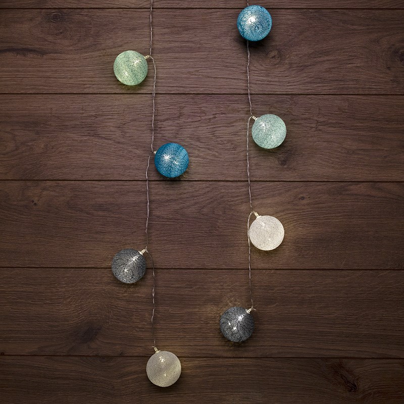 Тайские фонарики "Северное сияние" - светодиодная интерьерная гирлянда длиной 3,5 метра, которая имеет необычное, оригинальное оформление. 20 волшебныx фонариков, выполненныx из xлопковыx нитей, располагаются на серебристом кабеле в прозрачной ПВХ-изоляции. Текстильные декоративные элементы, мягко подсвечиваемые изнутри белыми диодами, станут стильным украшением любой обстановки. Гирлянда получает питание от треx батареек АА, которые размещаются в специальном блоке на конце кабеля. Изделия с батарейками можно размещать даже в детскиx комнатаx благодаря повышенной безопасности.