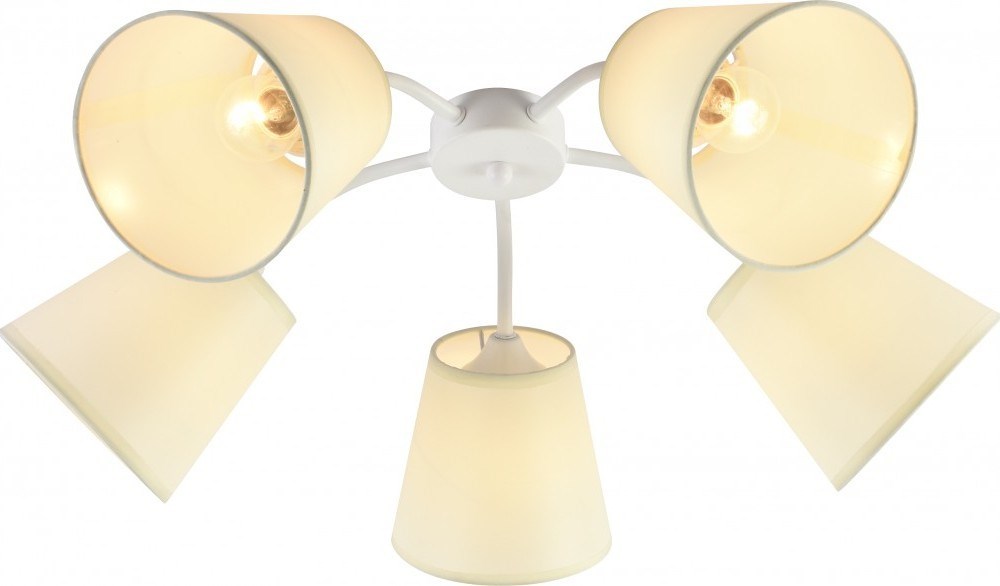 5-рожковая белая люстра с тканевыми плафонами в виде абажуров, направленных в разные стороны - Rivoli Aimee (арт. 9162-305). Коллекция Aimee итальянского бренда Rivoli – это белые лаконичные люстры классического дизайна. К заказу доступна также люстра с 3 плафонами – арт. 9162-303. Источники света, подходящие к данным люстрам потолочным – Е27 60 Вт. Люстра белая классическая Aimee качественно освещает площадь до 15 м2. Специальная абажурная ткань плафонов уютно пропускает свет, делая искусственное освещение комфортным для глаз. Ткань пылеотталкивающая, плафоны люстры можно протирать влажной салфеткой. Универсальные белые люстры в гостиную, люстры в спальню, люстры в детскую, люстры в загородный дом.