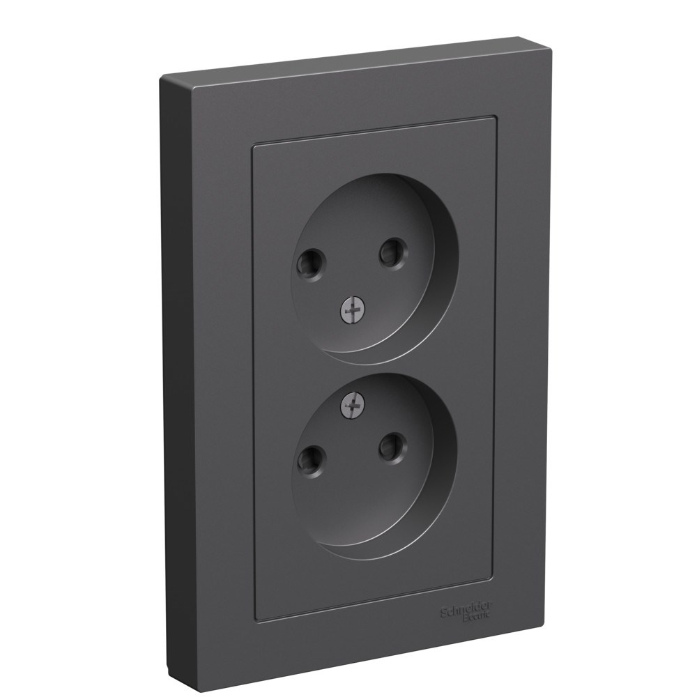 Розетка двойная Systeme Electric (ранее Schneider Electric) серии AtlasDesign (в сборе, цвет БАЗАЛЬТ) без заземления со шторками подходит для сетей 250 В, на ток 16 А. - Лицевые детали из качественного ABS-пластика, устойчивого к царапинам и УФ-излучению. - Двойная розетка позволяет подключить два устройства в одном месте. - Изделие поставляется в комплекте с рамкой того же цвета.