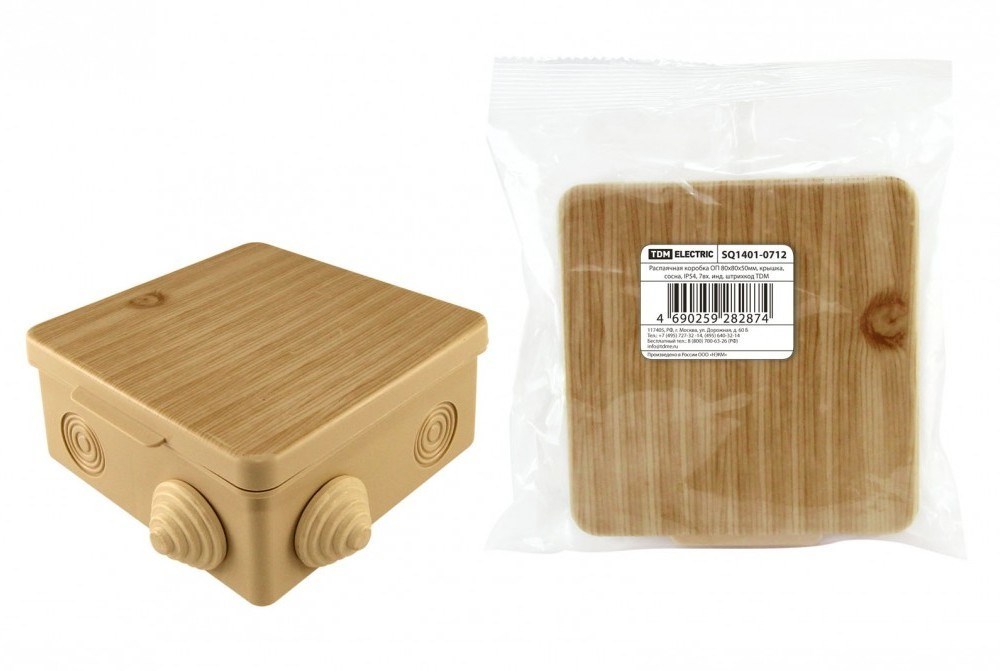 TDM Распаячная коробка ОП 80х80х50мм, крышка, "ЭКО" (сосна), IP54, 7вх. инд. штрихкод SQ1401-0712