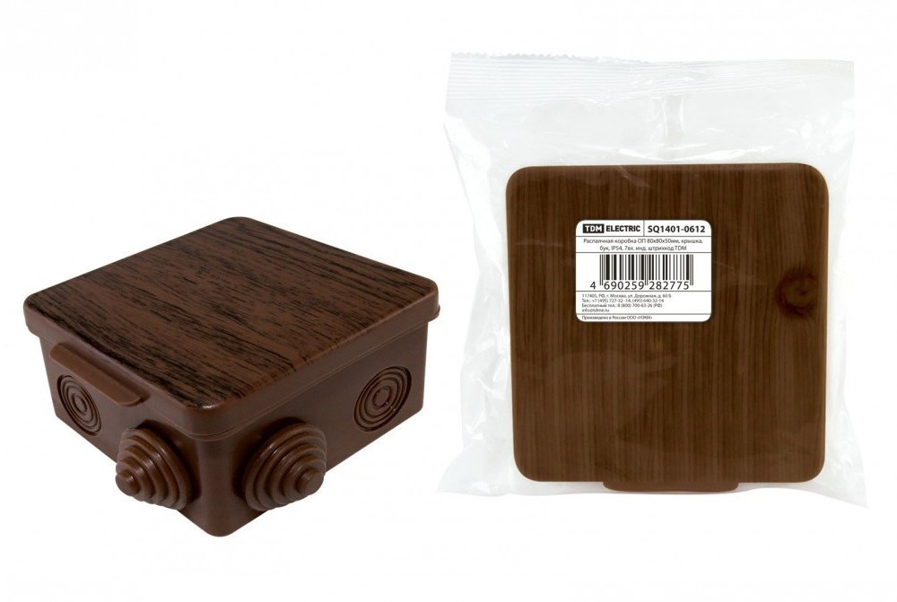 TDM Распаячная коробка ОП 80х80х50мм, крышка, "ЭКО" (венге), IP54, 7вх. инд. штрихкод SQ1401-0612
