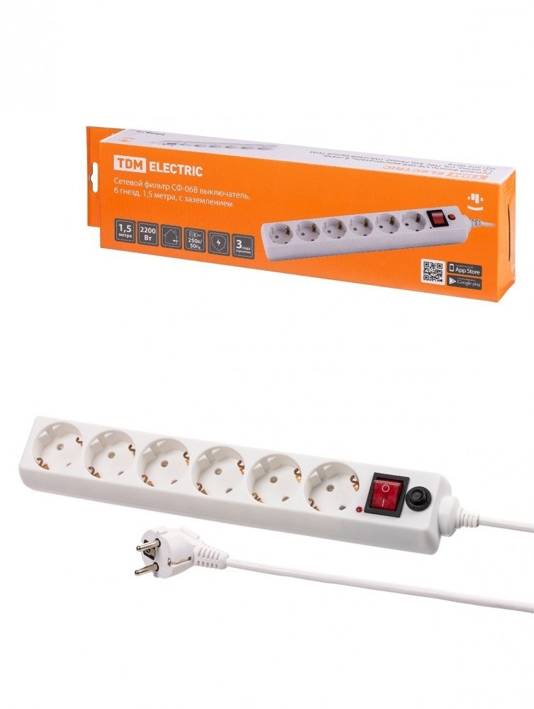 TDM Сетевой фильтр СФ-06В выключатель, 6 гнезд, 1,5 метра, с/з, ПВС 3х0,75мм2 10А/250В белый SQ1304-0019