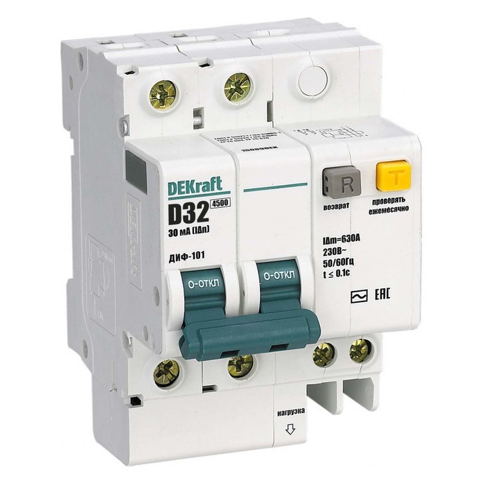 Автоматический выключатель дифференциального тока серии ДИФ-101 DEKraft; 2P; ном.ток 63 А; характеристика D; откл.способность Icn = 4,5 kA; ток утечки 300 мА; блок дифф.защиты and ndash; электронный; ширина and ndash; 4 мод. х 18 мм; монтаж and ndash; на DIN-рейку. АВДТ серии ДИФ-101 применяются в сетях напряжением до 400 В пер.тока для защиты электроустановок от сверхтоков и токов утечки. Для расширения функционала АВДТ возможно использование аксессуаров от выключателей серии ВА-101.
