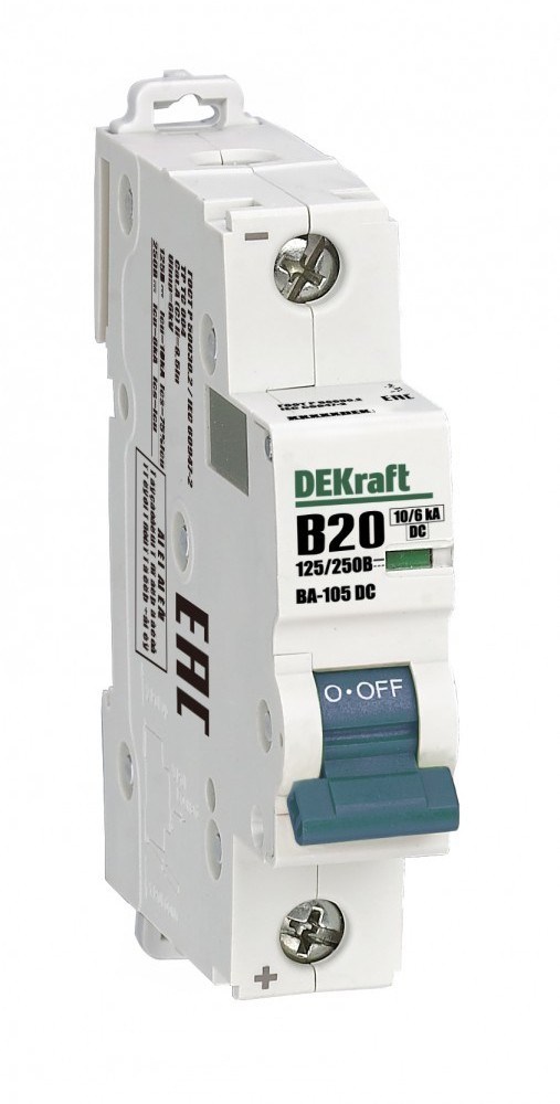 Автоматический выключатель серии ВА-105 DC DEKraft; 1P; ном. ток 20 А; характеристика В; откл. способность Icn = 10 кА при 125 В/6 кА при 250 В; установка and ndash; на DIN-рейку; ширина and ndash; 1 мод. х 18мB518:B524м. Выключатели ВА-105 DC применяются для защиты от перегрузки и КЗ в цепях постоянного тока, в частности в системах автоматизации и управления, транспорта, генерации и распределения электроэнергии и др. Окошко-индикатор всегда показывает состояние аппарата вне зависимости от положения рукоятки управления.