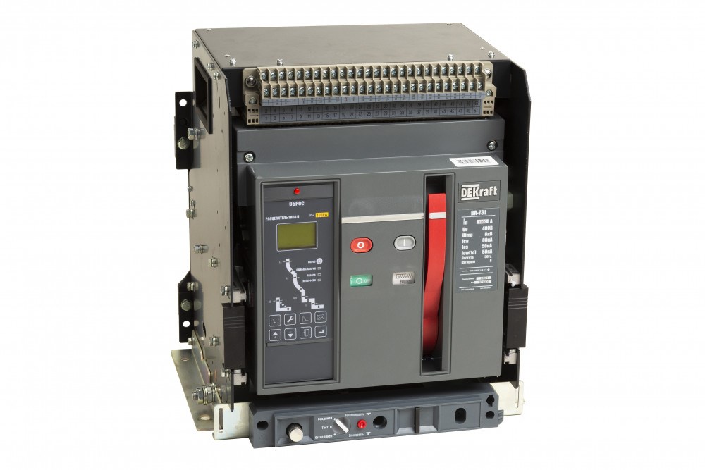 Воздушный автоматический выключатель серии ВА-731 DEKraft; 3P; номинальный ток 1000 А; отключающая способность 80 кА, выкатной, блок управления типа H; присоединения задние горизонтальные. В базовую комплектацию входят моторный привод (230 В пер.тока), 4 контакта состояния ВКЛ/ОТКЛ, сигнальный контакт, электромагнит включения (230 В пер.тока), независимый расцепитель (230 В пер.тока), разделители полюсов и рамка передней панели. Выключатели с блоком управления типа H позволяют осуществлять мониторинг и диспетчеризацию защищаемой сети и нагрузок.