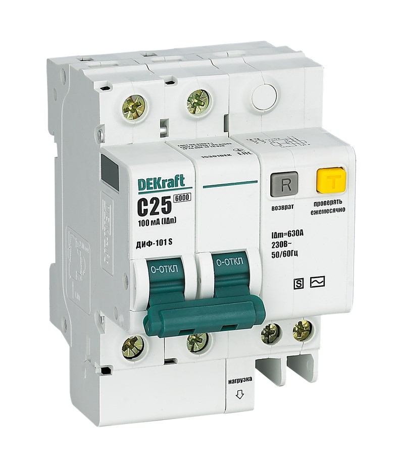 Автоматический выключатель дифференциального тока серии ДИФ-101 S DEKraft; селективный; 2P; ном.ток 40 А; характеристика C; откл.способность Icn = 6 кА; ток утечки 300 мА; блок дифф.защиты and ndash; электронный; ширина and ndash; 4 мод. х 18 мм; монтаж and ndash; на DIN-рейку. АВДТ применяются в сетях напряжением до 400 В пер.тока для защиты электроустановок от сверхтоков и токов утечки; в щитах, где требуется ступенчатая дифференциальная защита (задержка по срабатыванию).