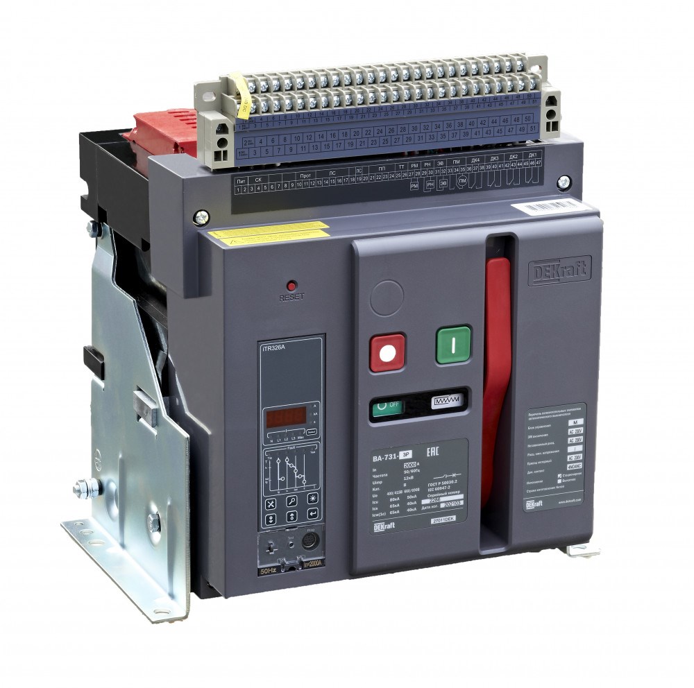 Воздушный автоматический выключатель серии ВА-731 DEKraft; 3P; номинальный ток 1250 А; отключающая способность 80 кА, стационарный, блок управления типа M; присоединения задние горизонтальные. В базовую комплектацию входят моторный привод (230 В пер.тока), 4 контакта состояния ВКЛ/ОТКЛ, сигнальный контакт, электромагнит включения (230 В пер.тока), независимый расцепитель (230 В пер.тока), разделители полюсов и рамка передней панели.