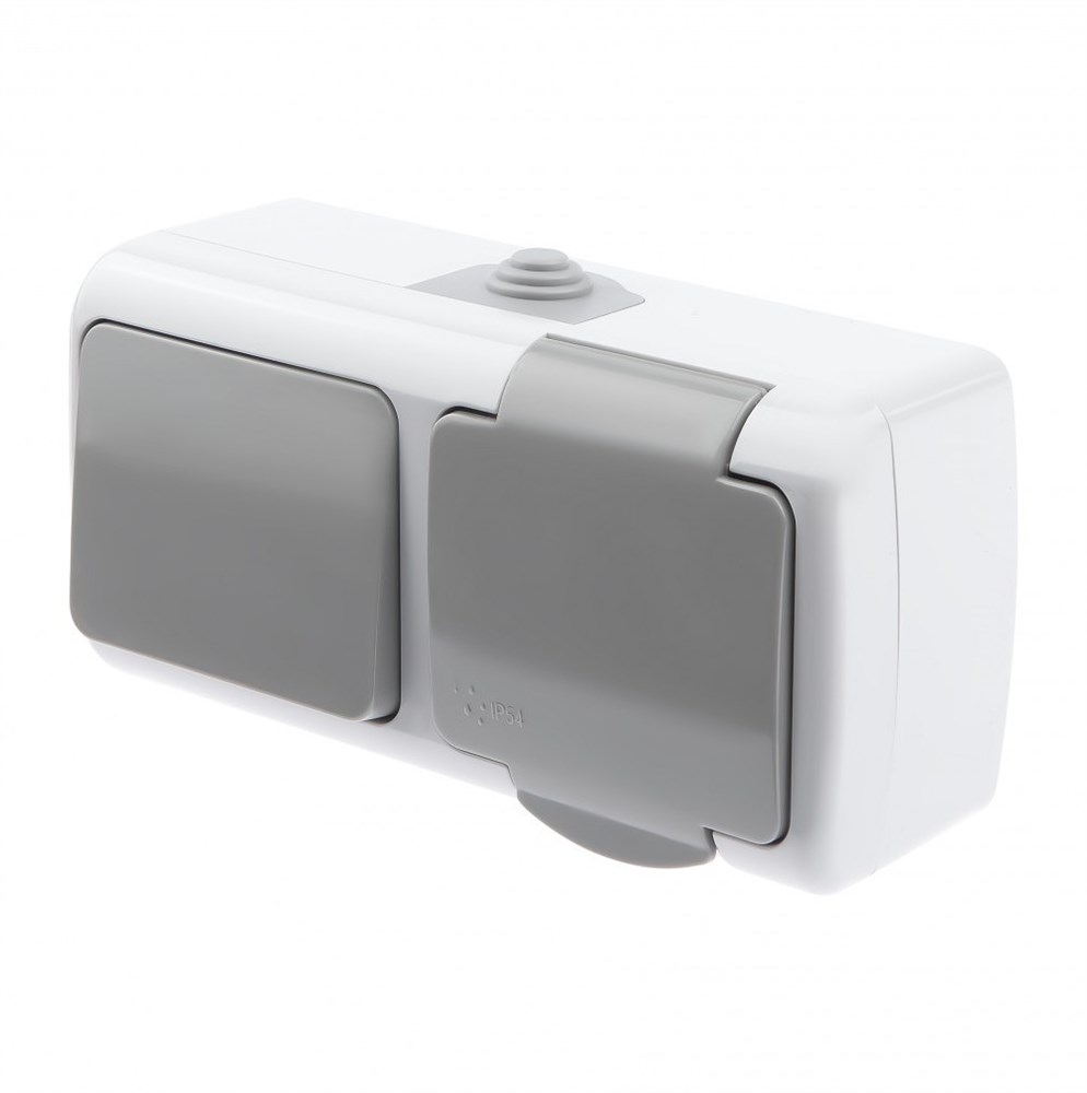 Блок розетка 2P+E + выключатель, 10(16)А-250В, ОУ, Atlantic, IP54, серый