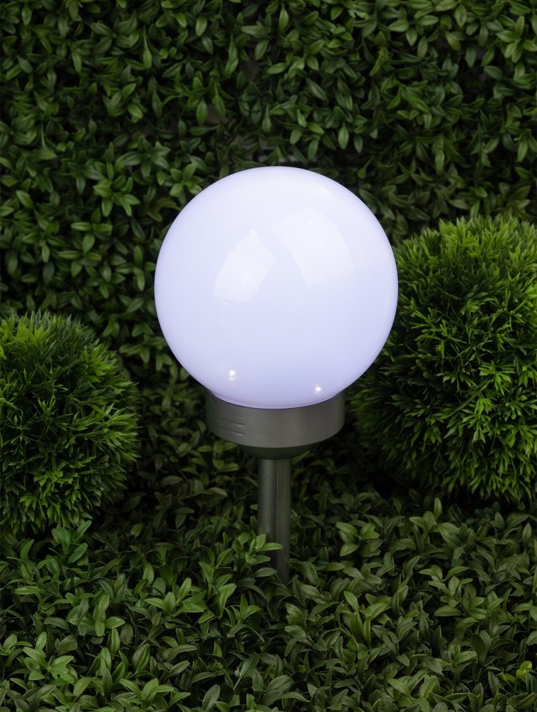 Классическая модель садового светильника в виде сферы. Мягкое свечение холодного белого света послужит прекрасным украшением при оформлении садовых дорожек и клумб.