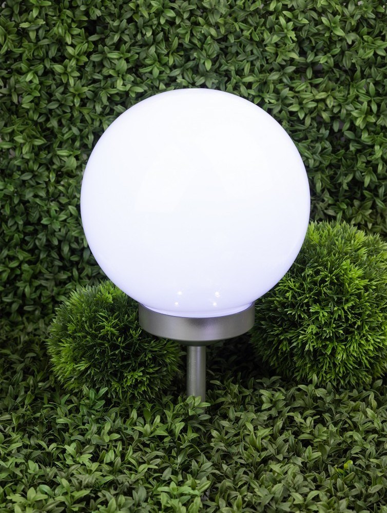 Классическая модель садового светильника в виде сферы. Мягкое свечение холодного белого света послужит прекрасным украшением при оформлении садовых дорожек и клумб.