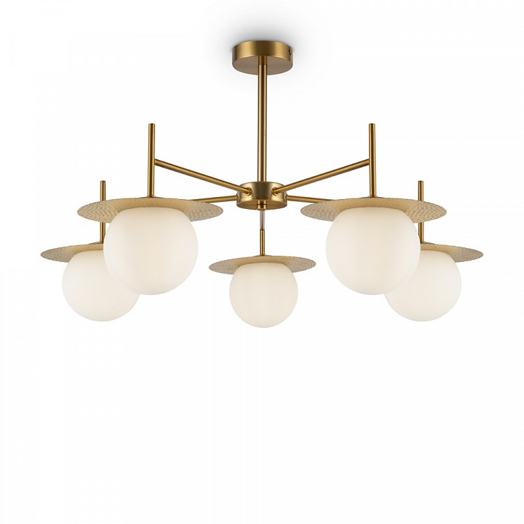 Дизайн серии Camelia объединил трендовые фактуры и силуэты. Металлическая арматура окрашена в цвет латуни. Благородный оттенок выгодно подчеркнут белыми плафонами из матового стекла. Их округлая сферическая форма – актуальный тренд в современном дизайне. Оригинальное решение – плоские розетки в тон арматуре. Рельефная поверхность с эффектом чеканки создает модный микс фактур. Серия включает потолочные люстры на 5, 8 плафонов и бра, что позволяет организовать как основное, так и зональное освещение. Компактные габариты светильников актуальны, в том числе, для невысоких потолков. Серия займет достойное место в интерьерах современных спален и гостиных, оформленных в стиле эклектика, mid-century modern, минимализм.