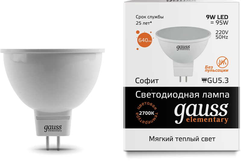 Gauss Лампа Elementary MR16 9W 640lm 3000K GU5.3 LED 13519