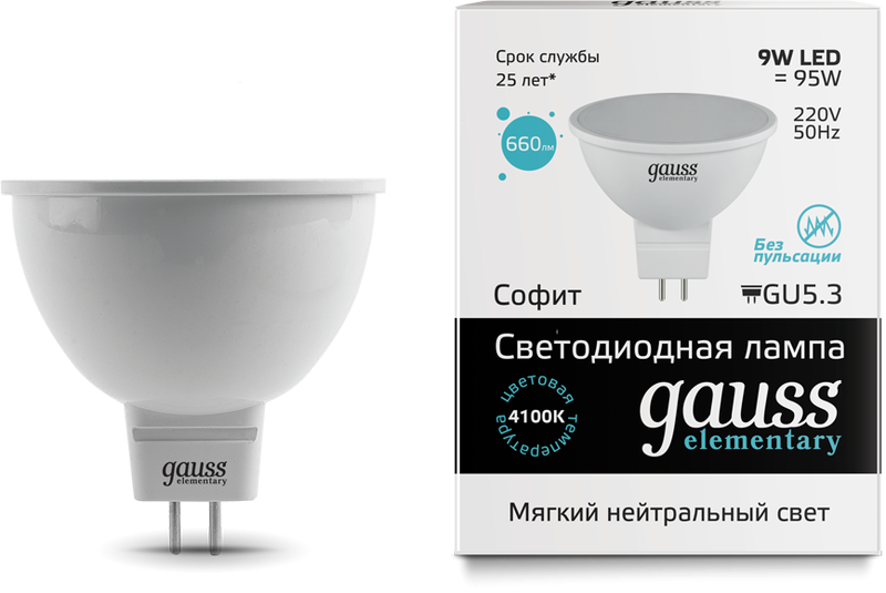 Gauss Лампа Elementary MR16 9W 660lm 4100K GU5.3 LED 13529