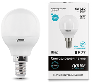 Gauss Лампа Elementary Шар 6W 450lm 4100K Е14 LED 53126
