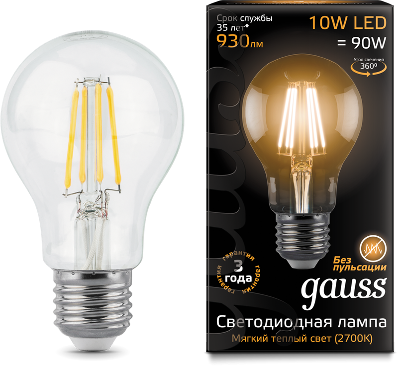 Светодиодные филаментные лампы GAUSS - это новейшие технологии в светотехнике. Лампы имеют привычный вид классических ламп накаливания, освещают пространство на 360о и дают больше света по сравнению с обычными светодиодными лампами за счет прозрачной колбы. Идеально подходят для хрустальных люстр и открытых светильников, а также для реализации дизайнерских решений, где важен вид классических ламп накаливания.