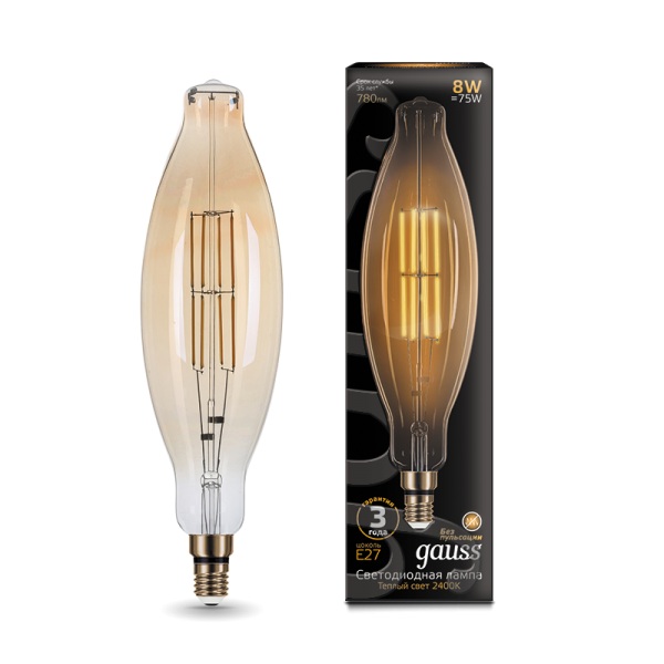 Gauss Лампа Filament BT120 6W 780lm 2400К Е27 golden straight LED 155802008