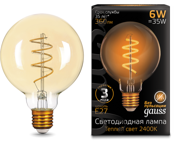 Gauss Лампа Filament G95 6W 360lm 2400К Е27 golden flexible LED 105802007