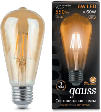 Gauss Лампа Filament ST64 6W 550lm 2400К E27 golden LED 102802006