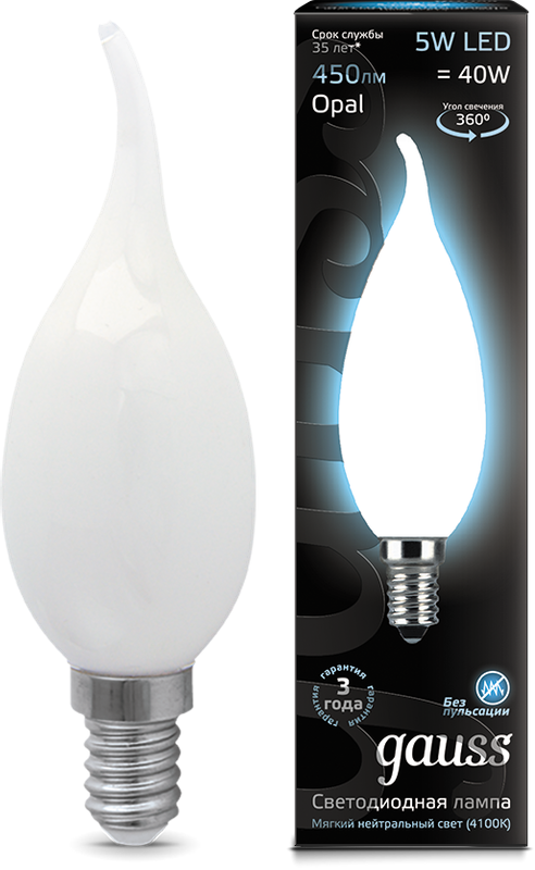 Gauss Лампа Filament Свеча на ветру 5W 450lm 4100К Е14 milky LED 104201205