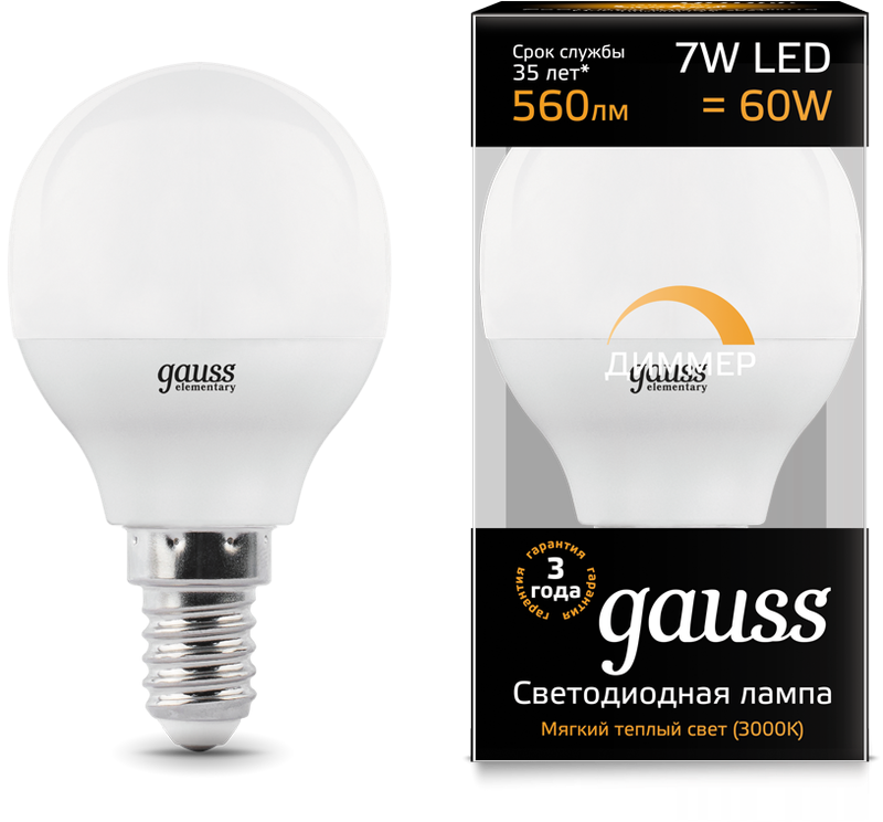 Gauss Лампа LED Шар-dim E14 7W 560lm 3000К диммируемая 105101107-D